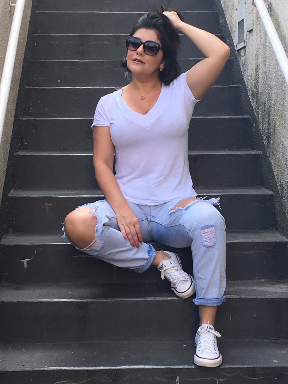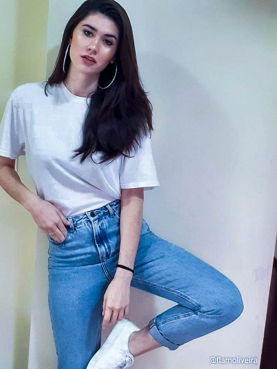 Flavia Mello optou por calça jeans clara, tênis e camiseta lisa e o charme do look ficou por conta dessas argolas transformando o look casual com uma pegada mais sexy.