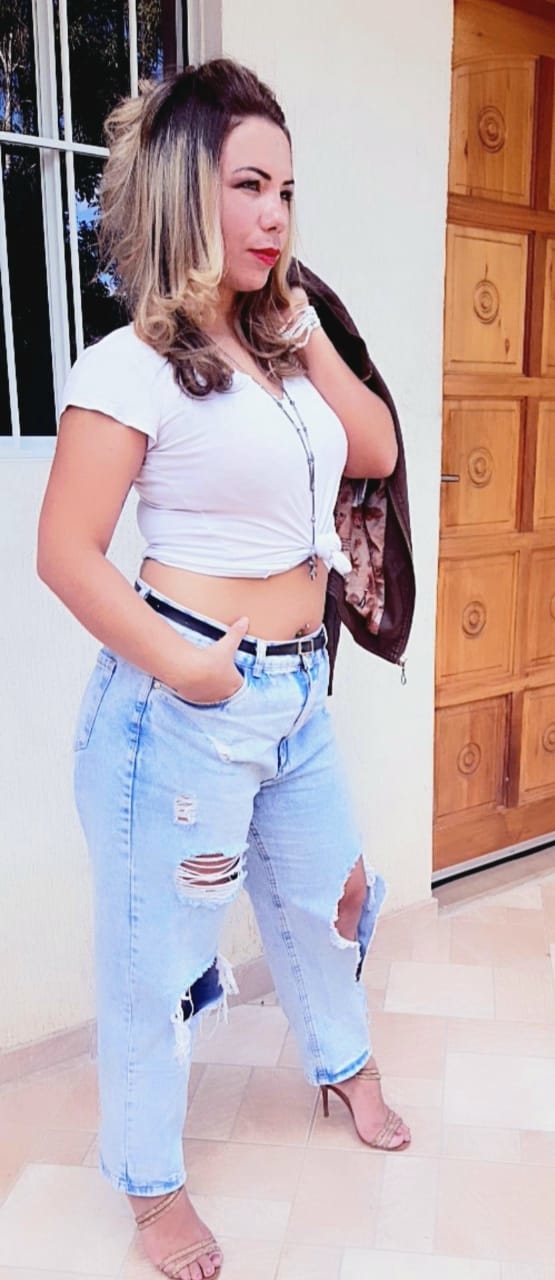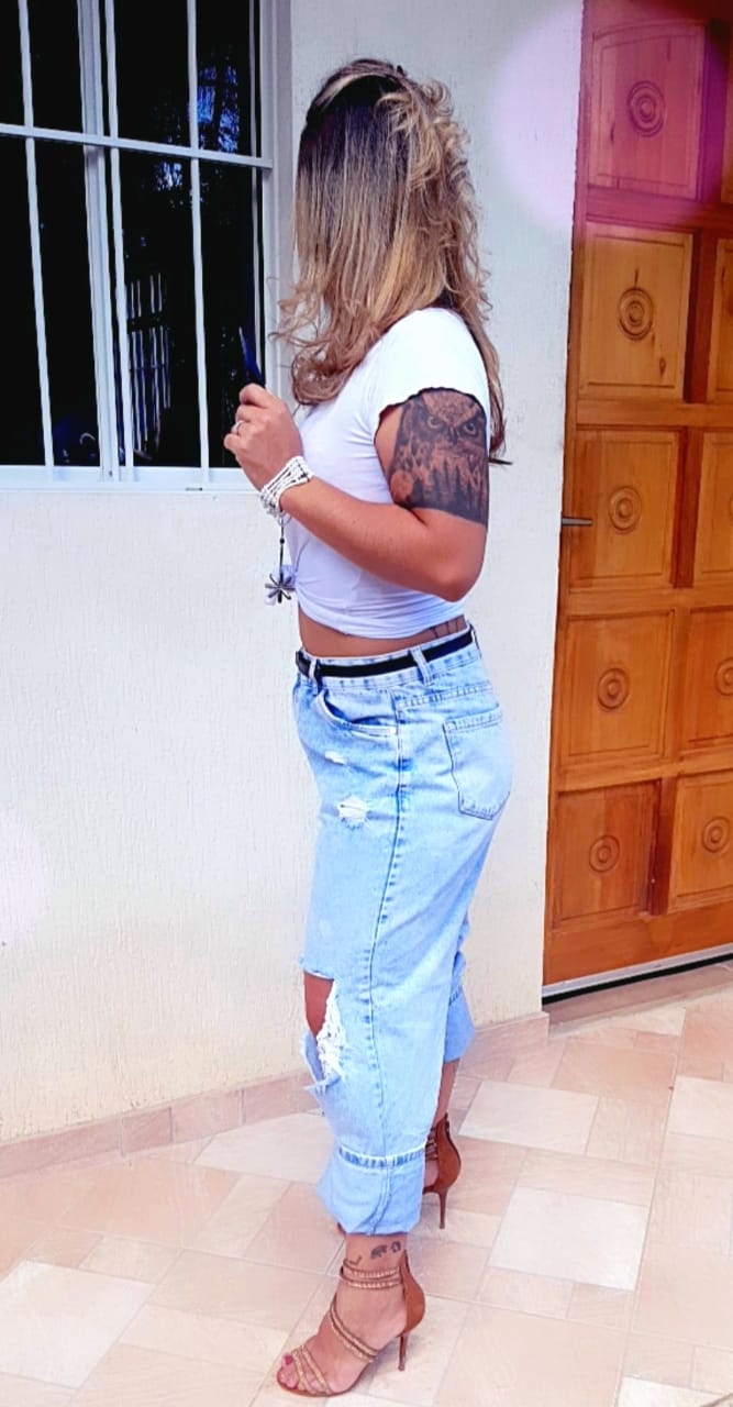 Pati preferiu um lado bem mais sexy com calça jeans rasgada, salto alto e batom vermelho, esse look é perfeito para noite e caso queira algo mais casual, ela pode trocar o salto por tênis.