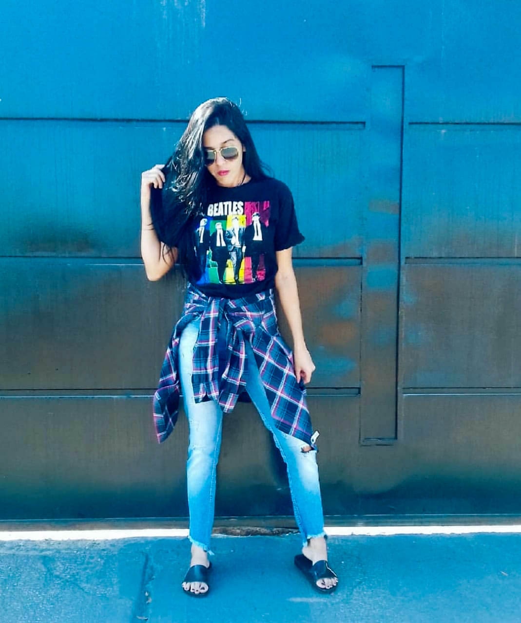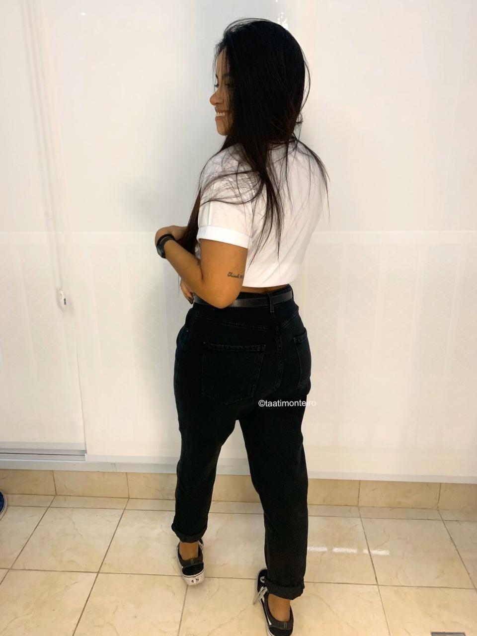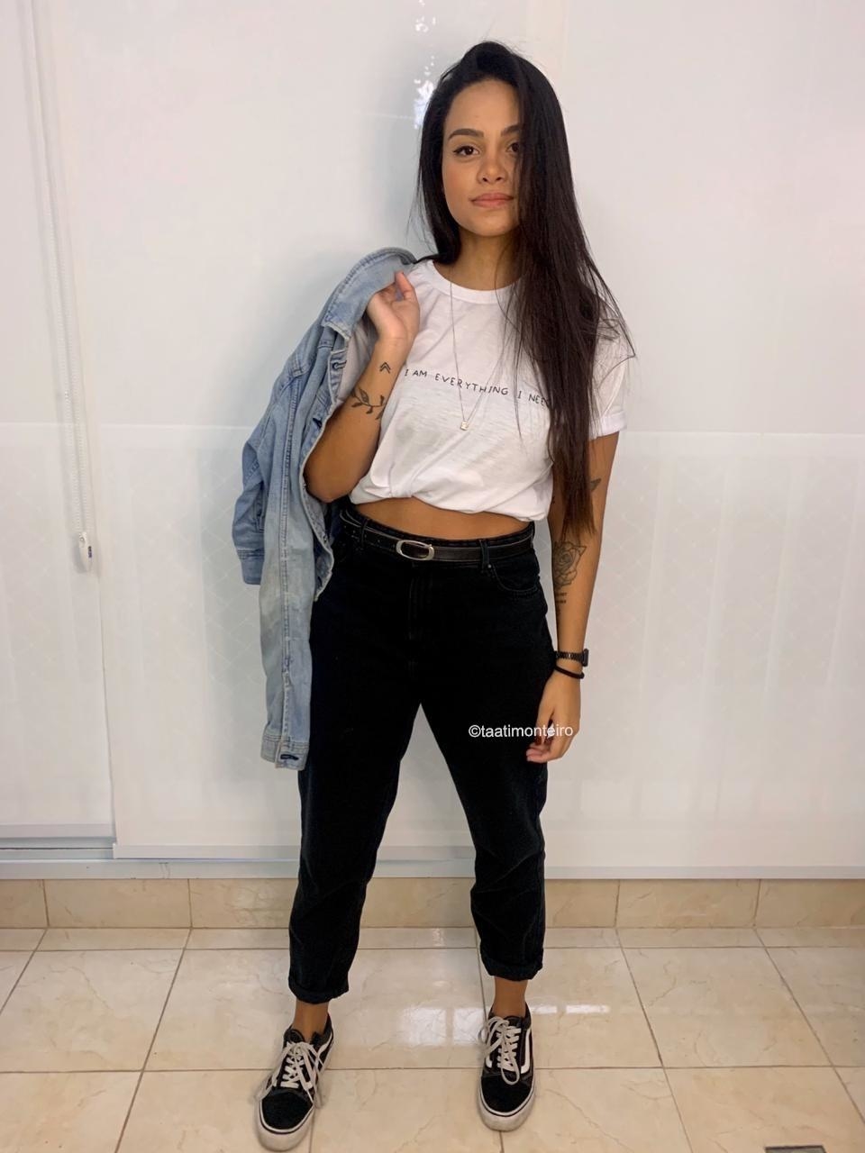 Tati Monteiro já optou por um look Tumblr e despojado, ao mesmo tempo que ela queria algo básico transformou o look com alguns truques de estilo usando cinto e uma maneira diferente de amarrar a camiseta.